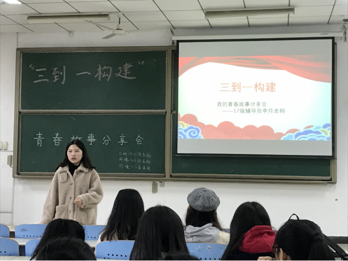 2019年11月18日土地17-1班、环工17-2班以及环工17-3班在博1A103教室联合举办了“三到一构建”之“我的青春故事分享会”主题团日活动。本次团日活动,我们邀请到17级辅导员李月老师为我们讲述她的青春故事。