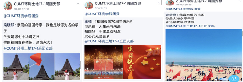 在国庆期间,土地17-1班举办了“喜迎国庆,为祖国70岁庆生”主题团日活动。团支部成员通过发布线上动态的方式,在祖国70岁华诞之际献上三行情诗,以表爱国之心。本活动旨在激发同学的爱国热情,加强爱国教育,树立正面阳光的价值观、爱国观。