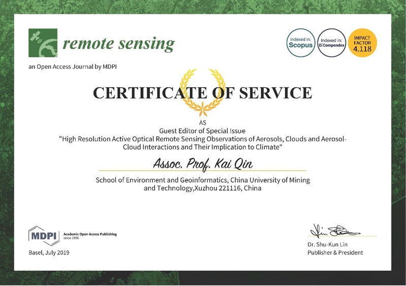 秦凯老师应邀担任SCI成人游戏期刊《Remote Sensing》的(JCR1区,2018年影响因子4.118)客座编辑(Guest Editor),与意大利CNR-IMAA的Simone Lolli博士、台湾国立中央大学Sheng-Hsiang (Carlo) 副教授、美国Naval Research Laboratory的James Campbell博士共同负责以“High Resolution Active Optical Remote Sensing Observations of Aerosols, Clouds and Aerosol-Cloud Interactions and Their Implication to Climate”为主题的专刊(Special Issue)出版工作。