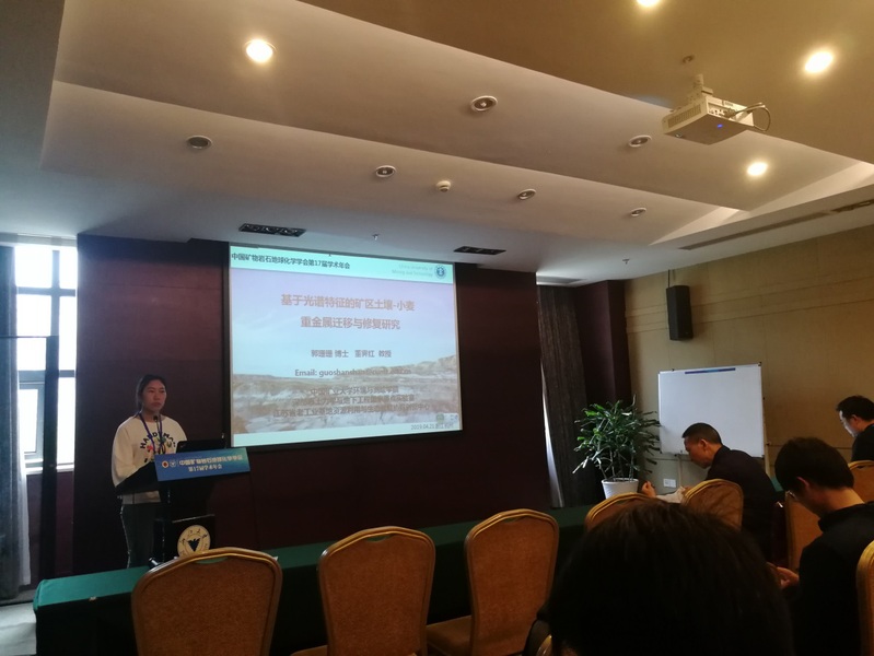 地球化学研究所联合承办,会议地址在浙江大学紫金港校区。会议云集了国内外矿物学家、地质学家、环境生物学家等相关学科的专家、学者3000余人。本次会议根据国内外本领域内学科发展趋势共设置30个专题,包括地球表层系统中矿物环境属性与效应、矿物表/界面过程、土壤重金属污染防治与修复问题研讨等。在“矿山污染与修复”专题会场, 郭珊珊博士做了“基于光谱特征的矿区土壤-小麦重金属迁移与修复研究”报告,报告基于四期自然条件下的矿区土壤重金属迁移模拟实验,分析了铬添加场地和正常对照场地铬、铅、锌、镉和铜含量在土壤中的迁移、富集特征,并针对矿区土壤重金属污染情况,设计了修复植物筛选的实验方法。