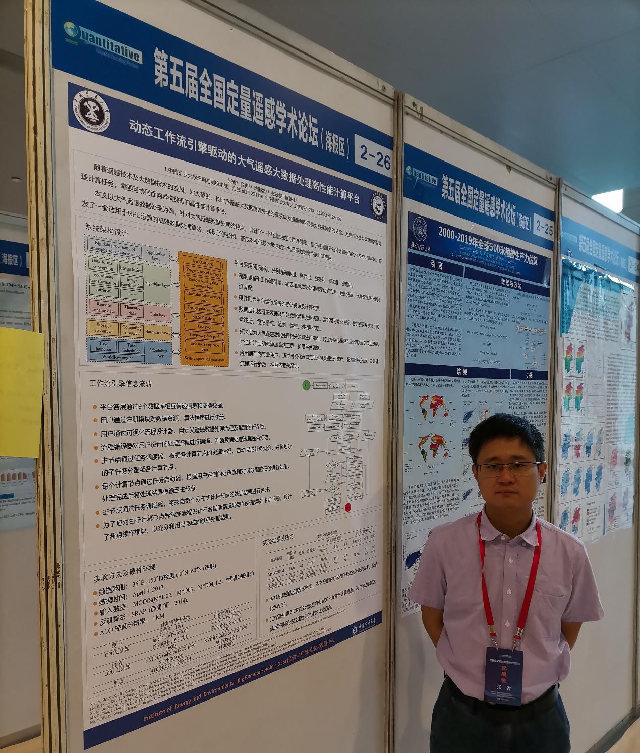 4位教师和多名研究生参加了这次成人游戏论坛。秦凯教授、郝明副教授和崔腾飞讲师分别做了题为 “二氧化氮卫星遥感数据产品及应用研究综述”、“集成热红外遥感多尺度信息的热异常探测”和“探索研究草原物候变化的最优多天合成卫星植被指数”的分会报告。5位同学做了海报展示,其中张省同学的海报“动态工作流引擎驱动的大气遥感大数据处理高性能计算平台”荣获“优秀学生报告”海报报告奖。